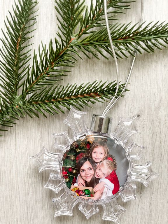 Прозрачный ёлочный шар "снежинка", печать фото с двух сторон. Вставка с фотографией внутри шара. Диаметр украшения 10 см.